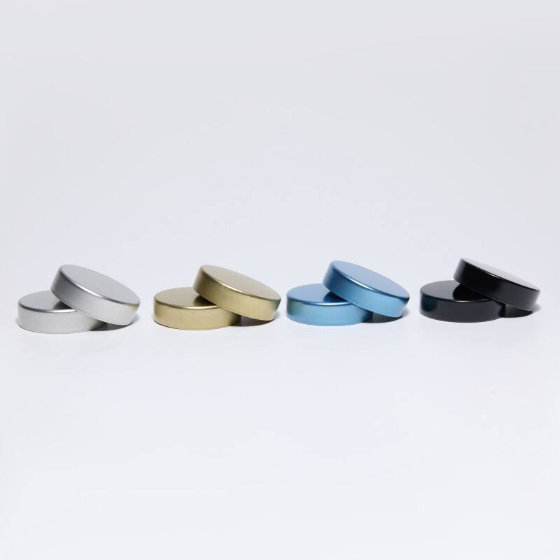 Our tinplate screw caps with inner threads, suitable for pill, supplement, and cosmetic jars. Features include customizable embossed logos, multiple size options (38mm-89mm), and various colors like silver, gold, and black. Trusted for pharmaceutical and cosmetic uses, these caps ensure secure sealing with PE foam or foil liners.